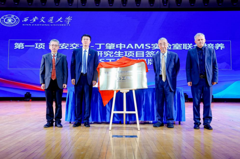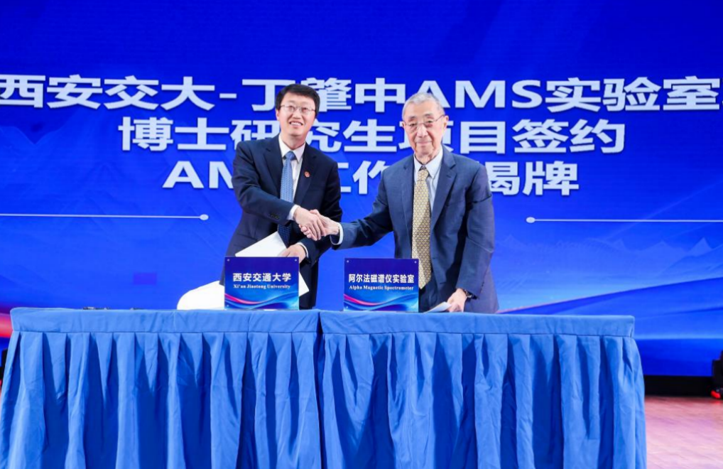 丁肇中、张立群签署西安交大-丁肇中AMS实验室联合培养博士研究生项目合作协议。丁肇中、张立群、维塔利、物理学院院长高宏共同为西安交通大学现代物理研究中心AMS工作室揭牌。
